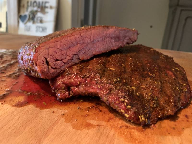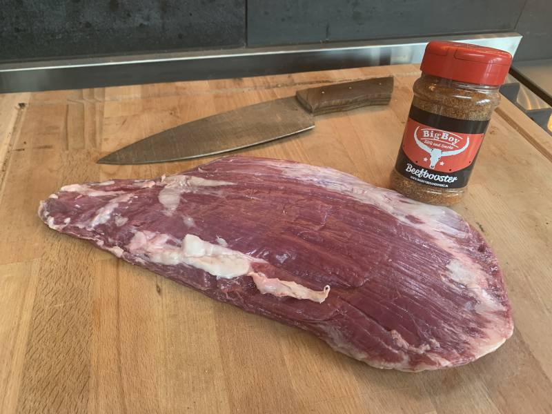 Ontdoe de Bavette of vinkelap van de harde stukken vet en rub hem vervolgens rondom in de Beefbooster.