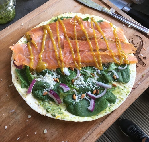 Zoek een paar mooie smakelijk uitziende plakken zalm uit en bedek de wrap hier voor de helft mee.
